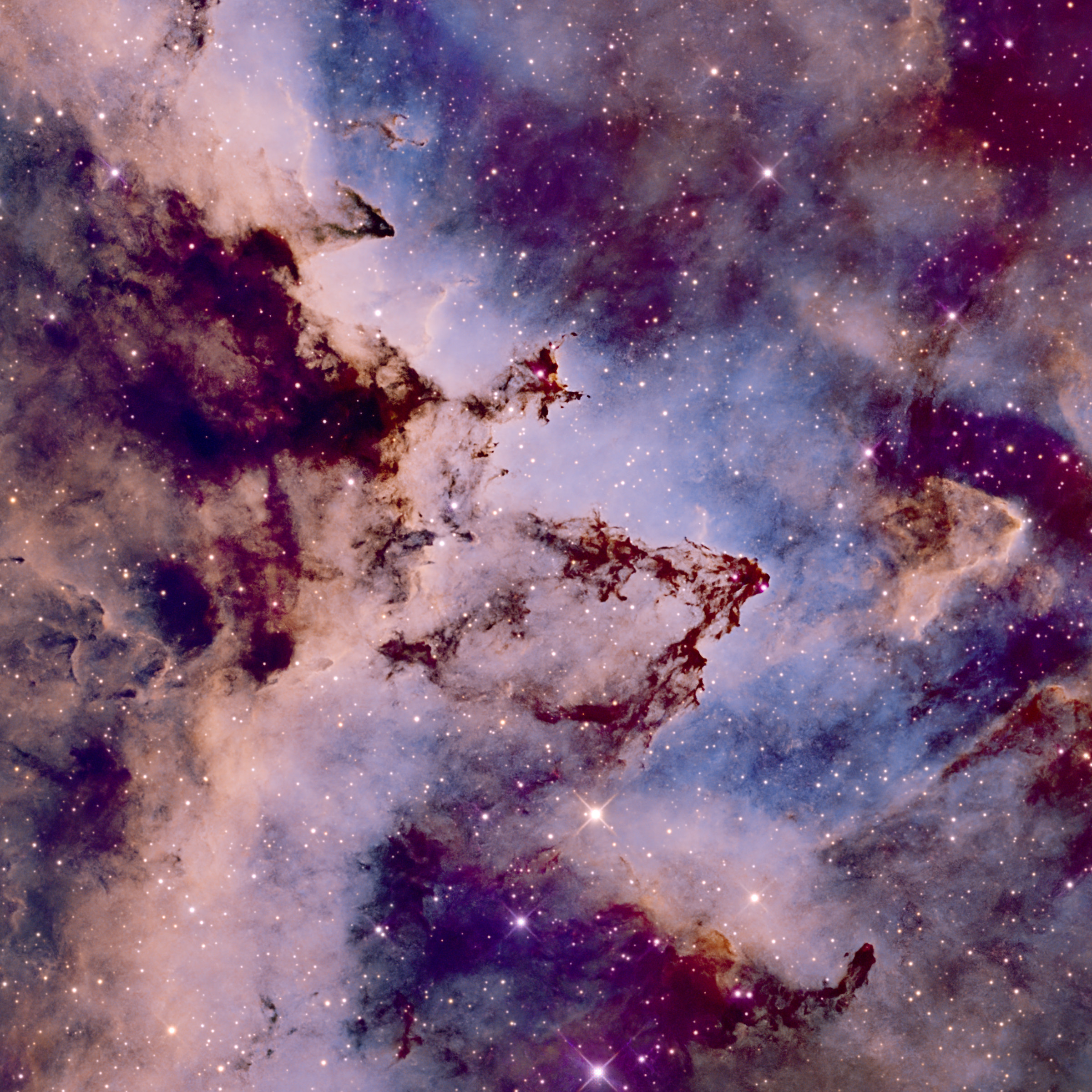 En el centro de la imagen destaca el cúmulo abierto Melotte 15. Este joven grupo de estrellas, de apenas 1,5 millones de años de edad, es el verdadero motor energético de la región. Sus estrellas masivas (algunas con 50 veces la masa de nuestro Sol) emiten una radiación ultravioleta tan intensa que ioniza el gas circundante y esculpe las densas torres de polvo y gas que vemos en el núcleo, recordándonos a los famosos "Pilares de la Creación".