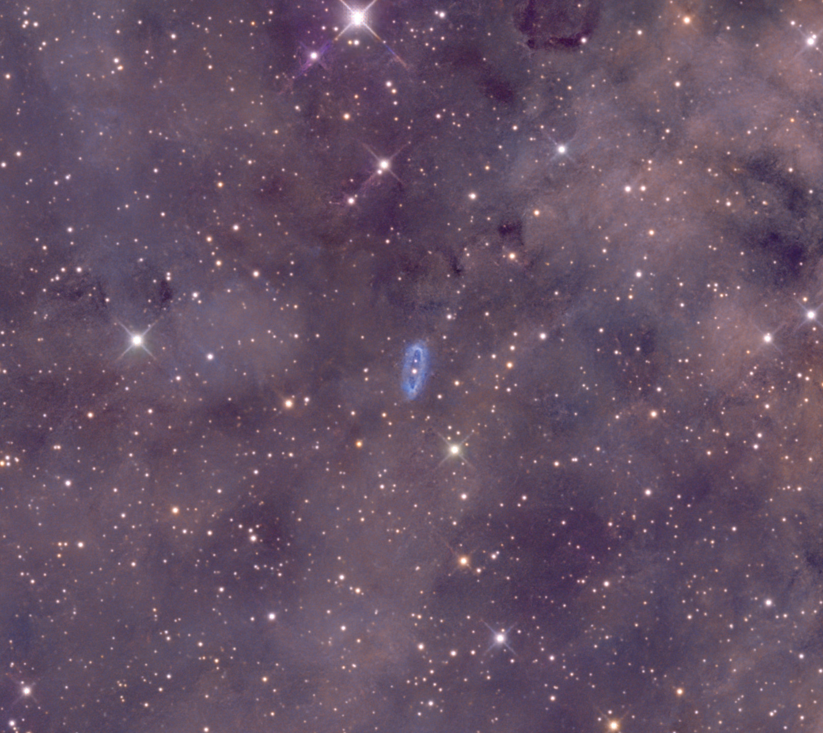 Uno de los objetos más fascinantes y discretos de esta toma es la nebulosa planetaria WeBo 1 (ubicada hacia la periferia de la estructura principal, cerca del borde derecho en encuadres amplios). Descubierta en 1995 por Webbink y Bond, WeBo 1 presenta una morfología inusual con un anillo delgado y brillante. Lo que la hace especial es su estrella central: un sistema binario donde una gigante de tipo espectral tardío está siendo "contaminada" por los residuos de una compañera que ya pasó por la fase de nebulosa planetaria, lo que la convierte en un laboratorio estelar único para entender la evolución de sistemas binarios.